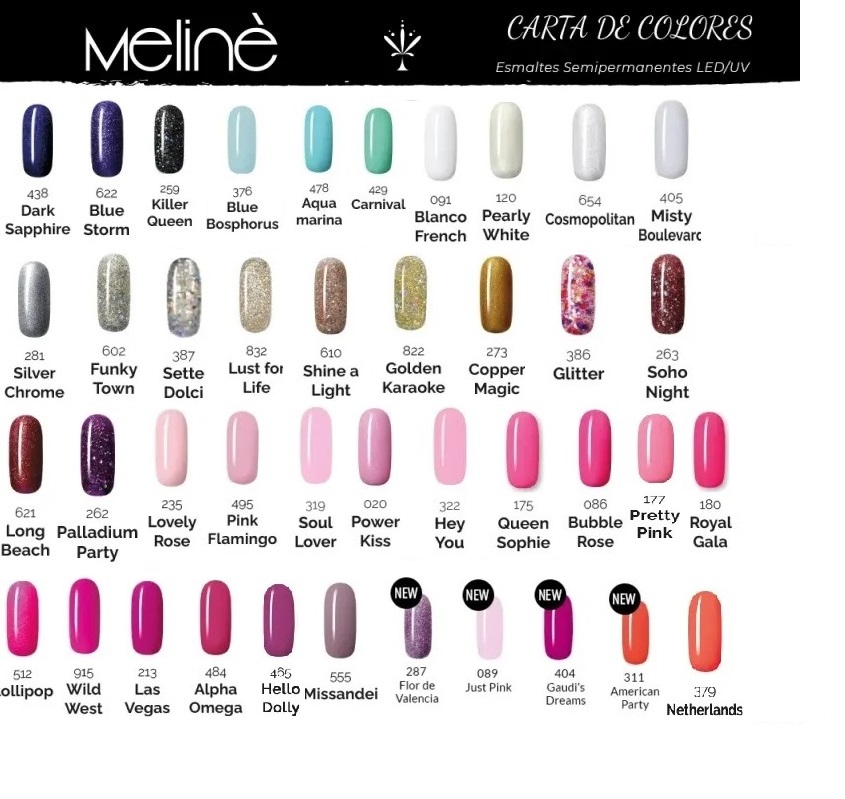 Esmalte Color Semipermanente Gel para cabinas LED/UV. El esmalte Meliné posee más de 20 variaciones de color y un impresionante poder cubritivo.