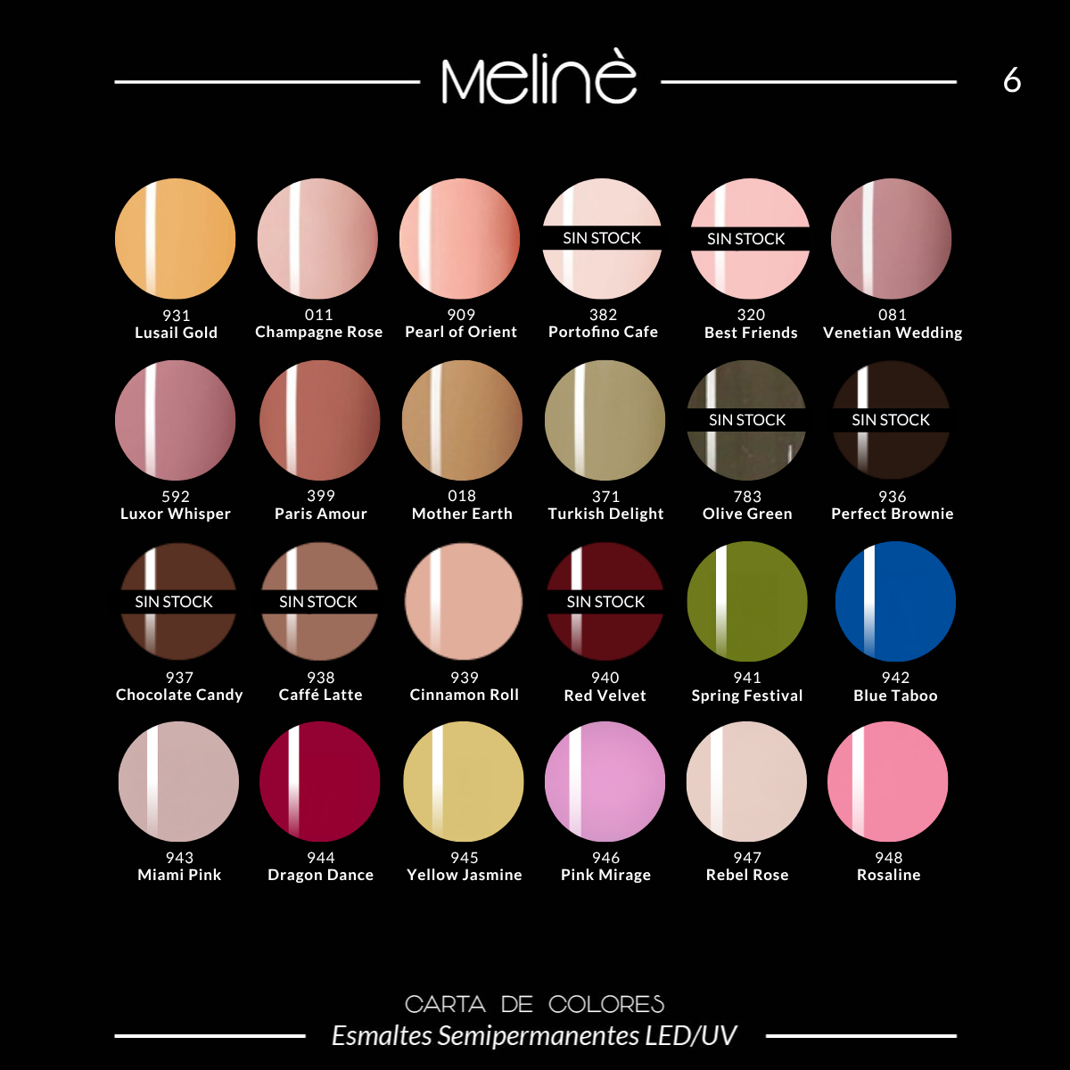 Esmalte Color Semipermanente Gel para cabinas LED/UV. El esmalte Meliné posee más de 20 variaciones de color y un impresionante poder cubritivo.