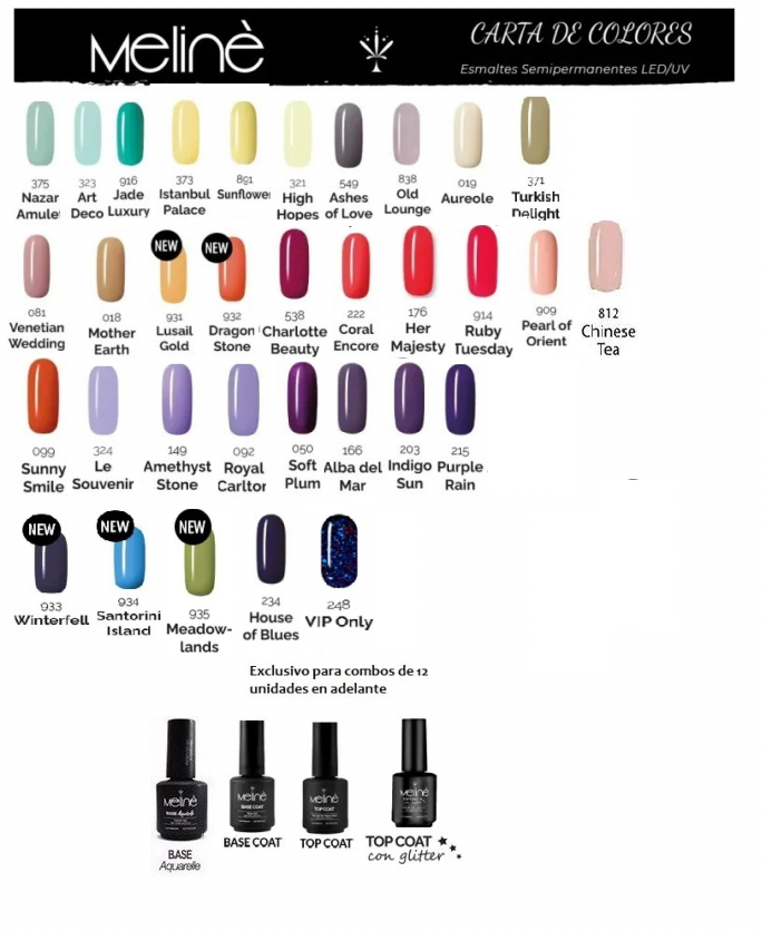 Esmalte Color Semipermanente Gel para cabinas LED/UV. El esmalte Meliné posee 24 variaciones de color y un impresionante poder cubritivo.