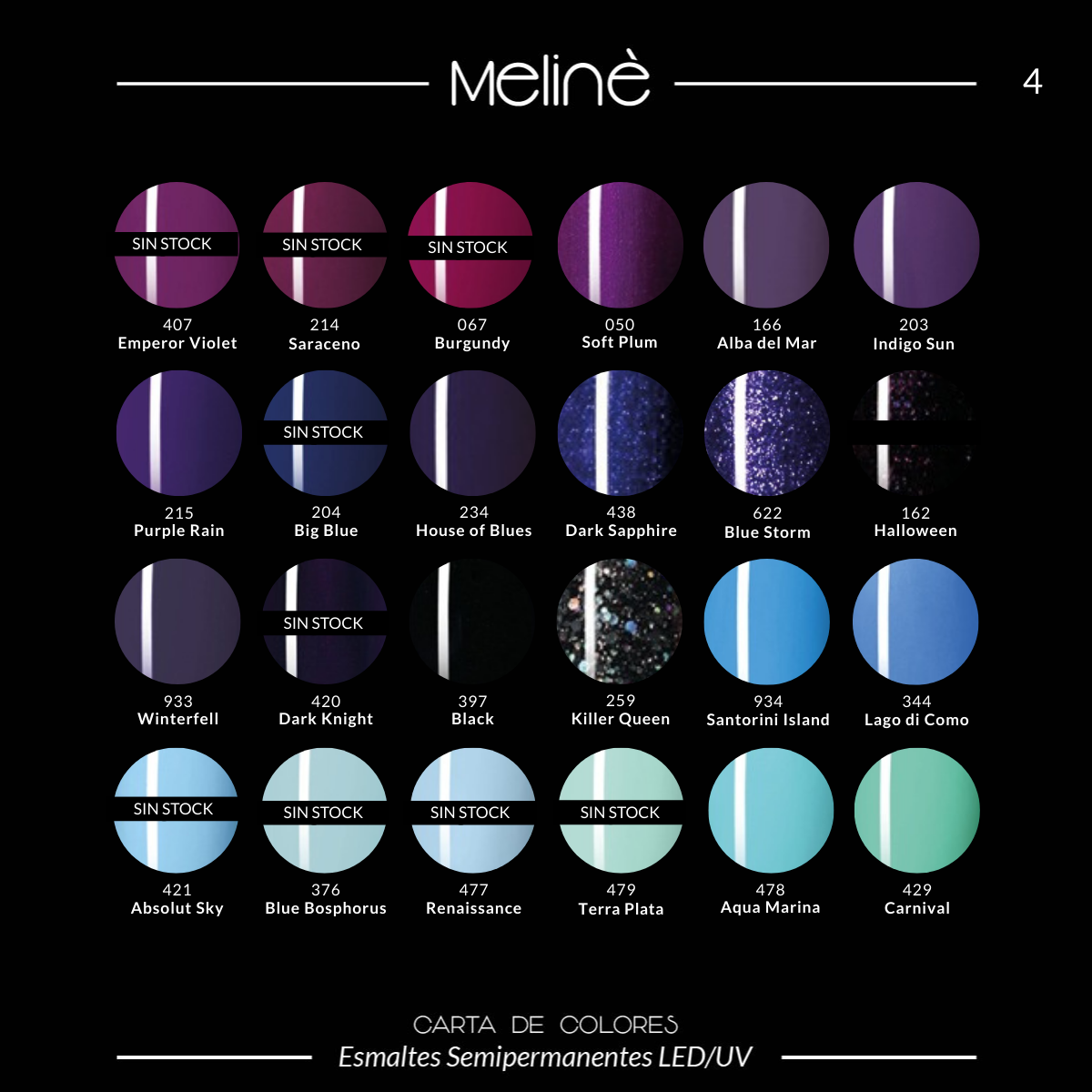 Esmalte Color Semipermanente Gel para cabinas LED/UV. El esmalte Meliné posee más de 20 variaciones de color y un impresionante poder cubritivo.